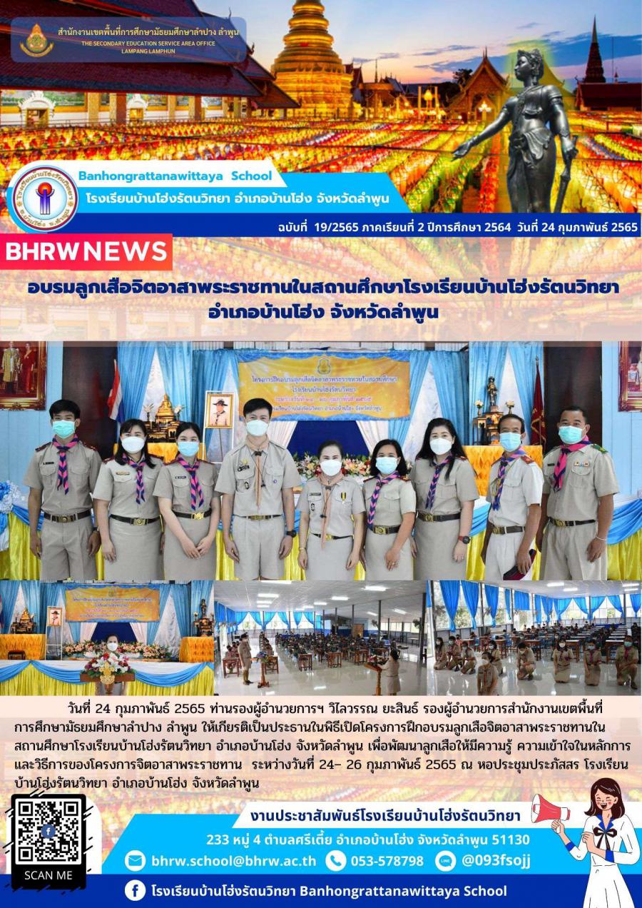 วันที่ 24 กุมภาพันธ์ 2565 ท่านรองผู้อำนวยการฯ วิไลวรรณ ยะสินธ์ รองผู้อำนวยการสำนักงานเขตพื้นที่การศึกษามัธยมศึกษาลำปาง ลำพูน ให้เกียรติเป็นประธานในพิธีเปิดโครงการฝึกอบรมลูกเสือจิตอาสาพระราชทานในสถานศึกษาโรงเรียนบ้านโฮ่งรัตนวิทยา อำเภอบ้านโฮ่ง จังหวัดลำพูน เพื่อพัฒนาลูกเสือให้มีความรู้ ความเข้าใจในหลักการและวิธีการของโครงการจิตอาสาพระราชทาน และส่งเสริมให้ลูกเสือน้อมนำหลักการและวิธีการของโครงการจิตอาสาพระราชทานไปจัดกิจกรรมจิตอาสาในสถานศึกษาและชุมชนได้อย่างมีประสิทธิภาพต่อไป โดยโครงการจัดขึ้น ระหว่างวันที่ 24– 26 กุมภาพันธ์ 2565 ณ หอประชุมประภัสสร โรงเรียนบ้านโฮ่งรัตนวิทยา อำเภอบ้านโฮ่ง จังหวัดลำพูน