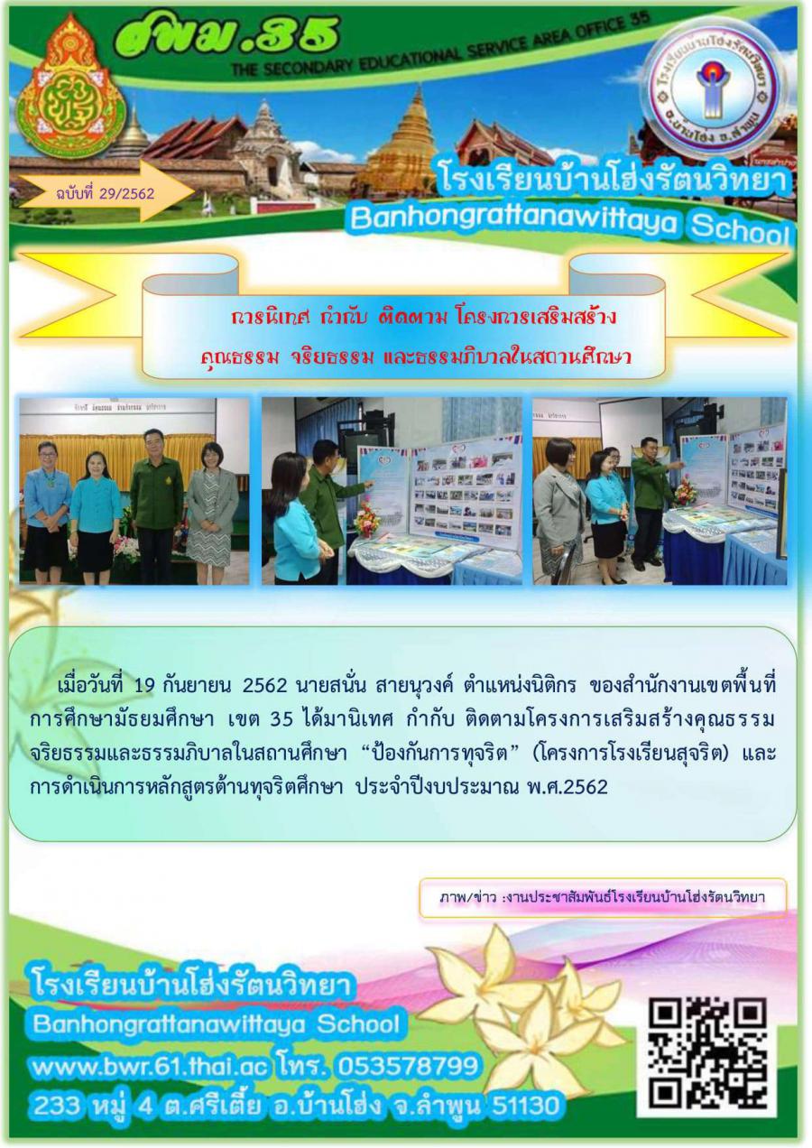 เมื่อวันที่ 19 กันยายน 2562 นายสนั่น สายนุวงค์ ตำแหน่งนิติกร ของสำนักงานเขตพื้นที่การศึกษามัธยมศึกษา เขต 35 ได้มานิเทศ กำกับ ติดตามโครงการเสริมสร้างคุณธรรม จริยธรรมและธรรมภิบาลในสถานศึกษา ?ป้องกันการทุจริต? (โครงการโรงเรียนสุจริต) และการดำเนินการหลักสูตรต้านทุจริตศึกษา ประจำปีงบประมาณ พ.ศ.2562