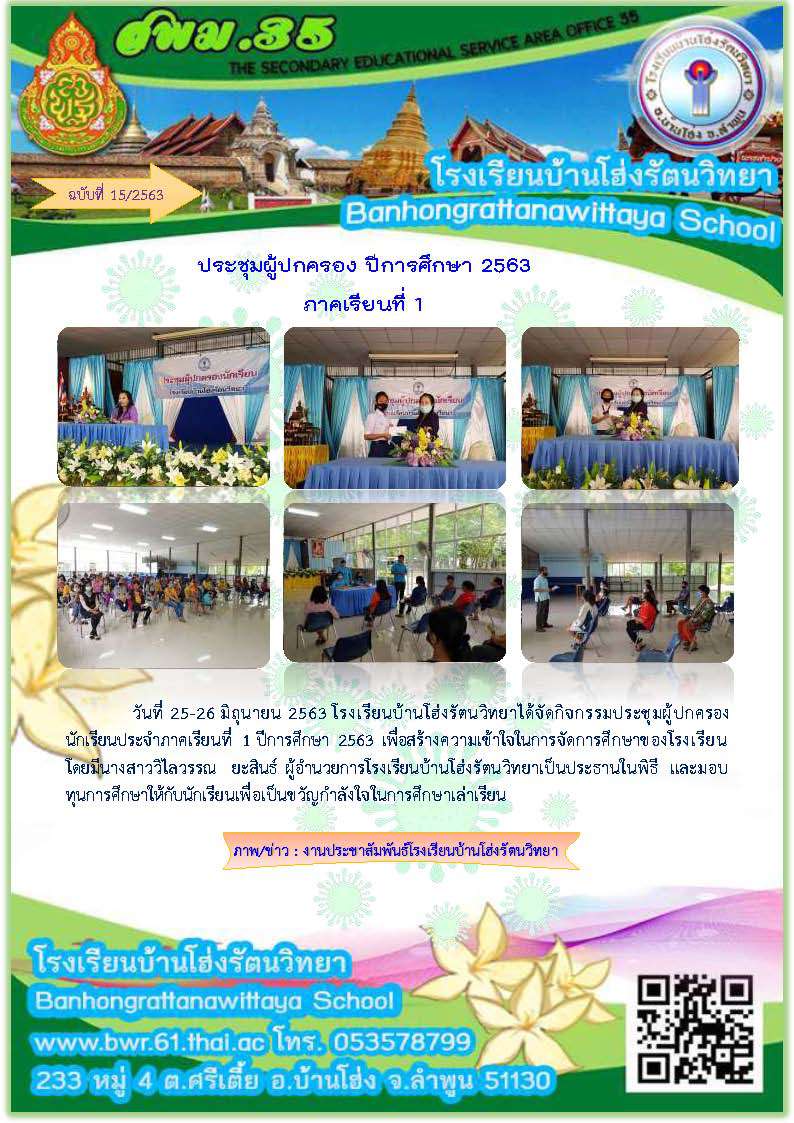 วันที่ 25-26 มิถุนายน 2563 โรงเรียนบ้านโฮ่งรัตนวิทยาได้จัดกิจกรรมประชุมผู้ปกครองนักเรียนประจำภาคเรียนที่ 1 ปีการศึกษา 2563 เพื่อสร้างความเข้าใจในการจัดการศึกษาของโรงเรียน โดยมีนางสาววิไลวรรณ  ยะสินธ์ ผู้อำนวยการโรงเรียนบ้านโฮ่งรัตนวิทยาเป็นประธานในพิธี และมอบทุนการศึกษาให้กับนักเรียนเพื่อเป็นขวัญกำลังใจในการศึกษาเล่าเรียน