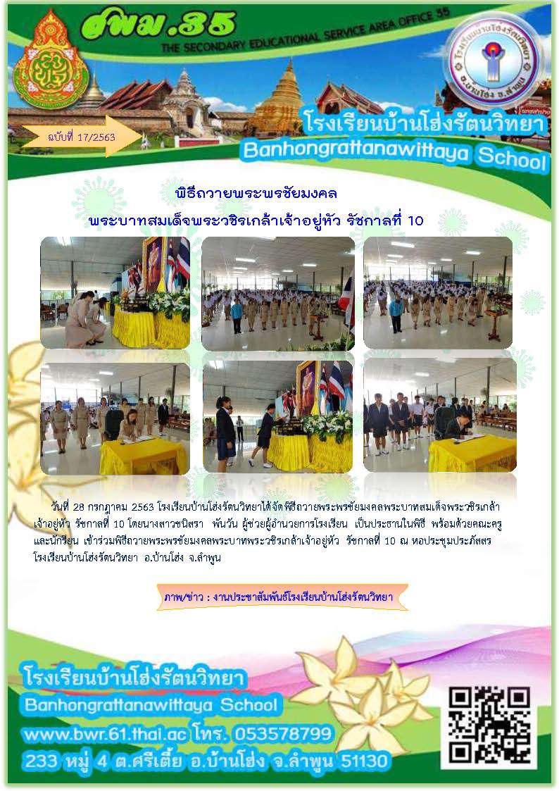 วันที่ 28 กรกฎาคม 2563 โรงเรียนบ้านโฮ่งรัตนวิทยาได้จัดพิธีถวายพระพรชัยมงคลพระบาทสมเด็จพระวชิรเกล้า เจ้าอยู่หัว รัชกาลที่ 10 โดยนางสาวชนิสรา  พันวัน ผู้ช่วยผู้อำนวยการโรงเรียน เป็นประธานในพิธี พร้อมด้วยคณะครู และนักรียน เข้าร่วมพิธีถวายพระพรชัยมงคลพระบาทพระวชิรเกล้าเจ้าอยู่หัว รัชกาลที่ 10 ณ หอประชุมประภัสสร โรงเรียนบ้านโฮ่งรัตนวิทยา อ.บ้านโฮ่ง จ.ลำพูน