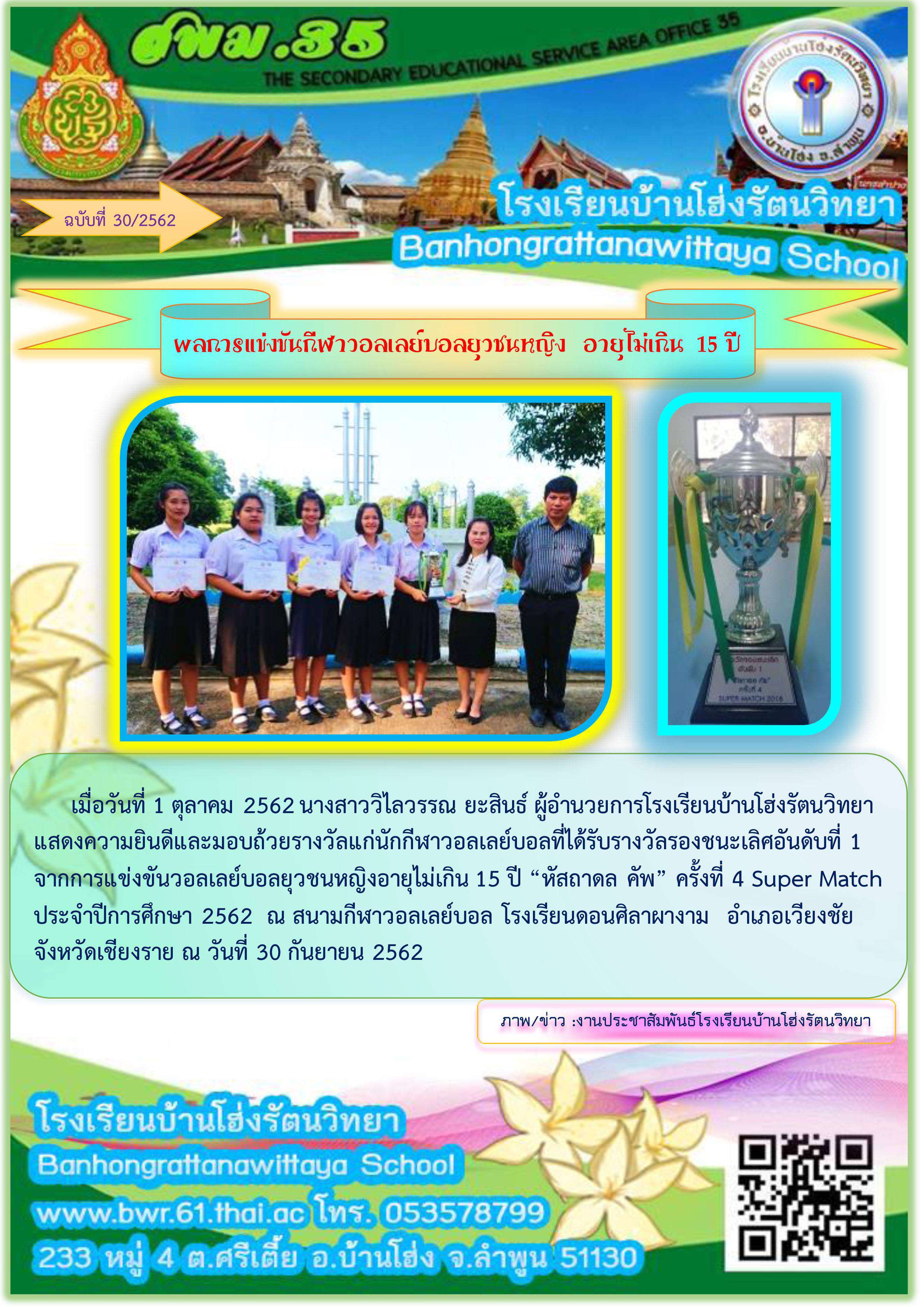 เมื่อวันที่ 1 ตุลาคม 2562 นางสาววิไลวรรณ ยะสินธ์ ผู้อำนวยการโรงเรียนบ้านโฮ่งรัตนวิทยา แสดงความยินดีและมอบถ้วยรางวัลแก่นักกีฬาวอลเลย์บอลที่ได้รับรางวัลรองชนะเลิศอันดับที่ 1 จากการแข่งขันวอลเลย์บอลยุวชนหญิงอายุไม่เกิน 15 ปี "หัสถาดล คัพ" ครั้งที่ 4 Super Match ประจำปีการศึกษา 2562 ณ สนามกีฬาวอลเลย์บอล โรงเรียนดอนศิลาผางาม อำเภอเวียงชัย จังหวัดเชียงราย ณ วันที่ 30 กันยายน 2562