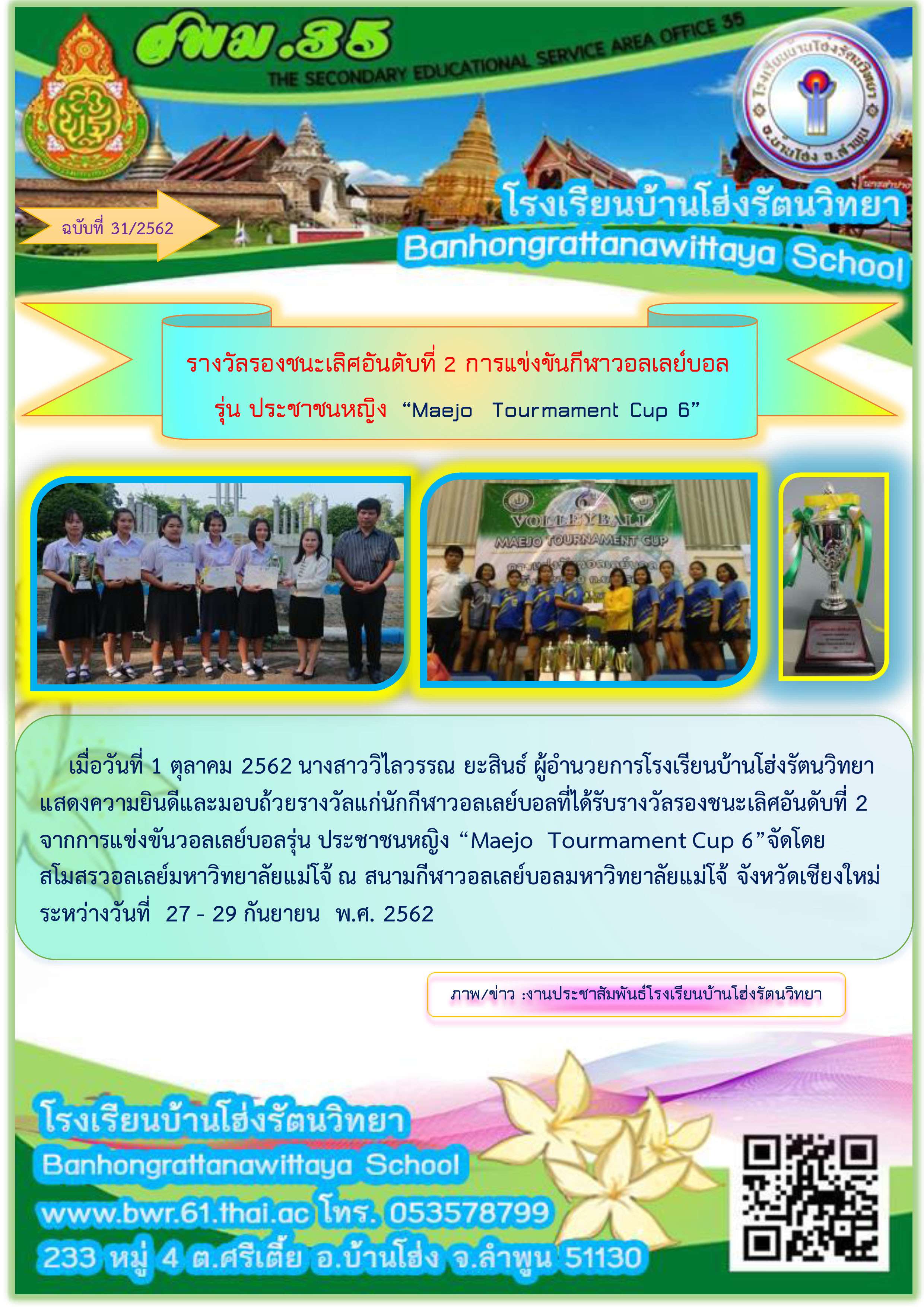 เมื่อวันที่ 1 ตุลาคม 2562 นางสาววิไลวรรณ ยะสินธ์ ผู้อำนวยการโรงเรียนบ้านโฮ่งรัตนวิทยา แสดงความยินดีและมอบถ้วยรางวัลแก่นักกีฬาวอลเลย์บอลที่ได้รับรางวัลรองชนะเลิศอันดับที่ 2 จากการแข่งขันวอลเลย์บอลรุ่น ประชาชนหญิง "Maejo Tourmament Cup 6" จัดโดย สโมสรวอลเลย์มหาวิทยาลัยแม่โจ้ ณ สนามกีฬาวอลเลย์บอลมหาวิทยาลัยแม่โจ้ จังหวัดเชียงใหม่ ระหว่างวันที่ 27 - 29 กันยายน พ.ศ. 2562