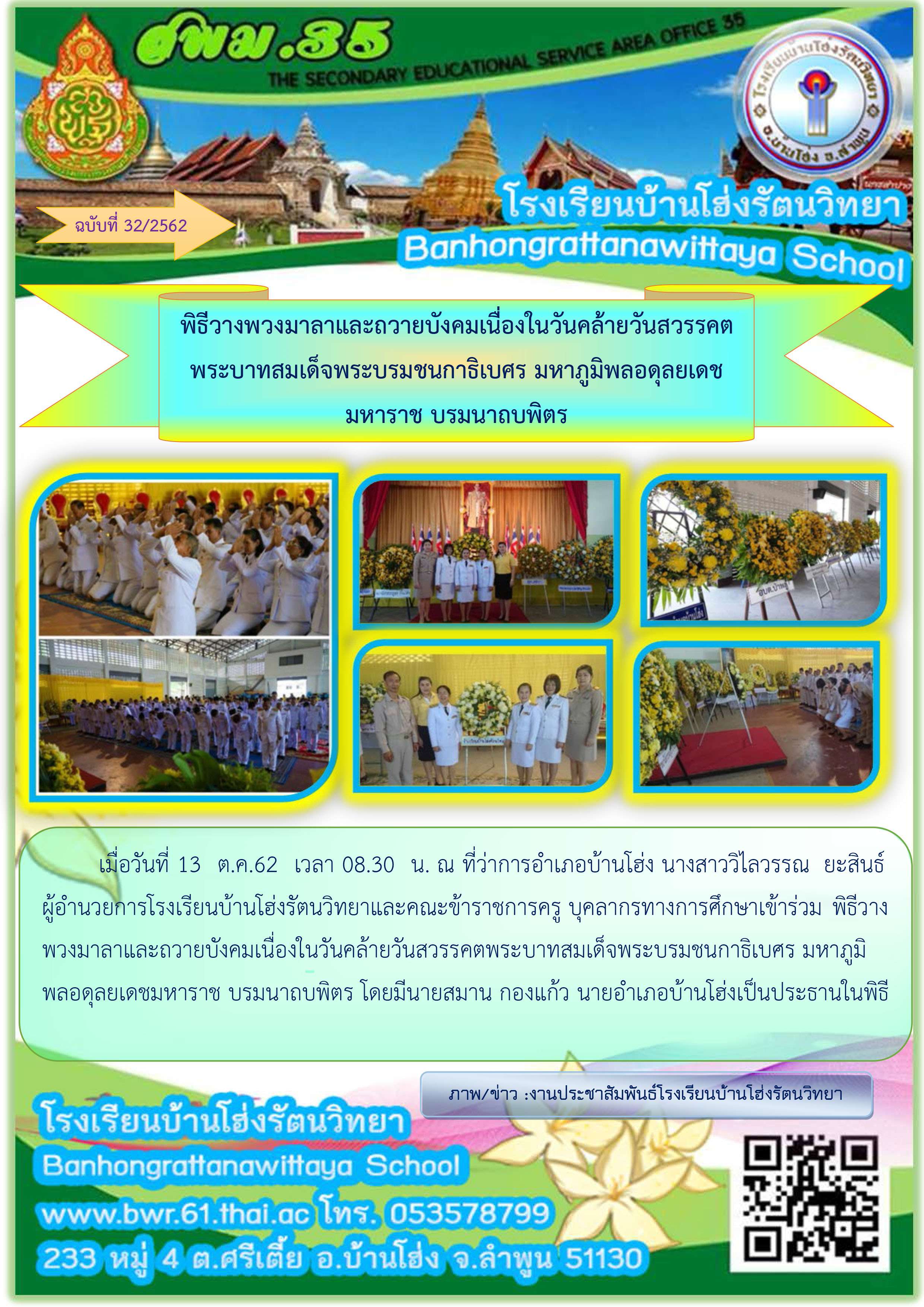 เมื่อวันที่ 13 ต.ค.62 เวลา 08.30 น. ณ ที่ว่าการอำเภอบ้านโฮ่ง นางสาววิไลวรรณ ยะสินธ์ผู้อำนวยการโรงเรียนบ้านโฮ่งรัตนวิทยาและคณะข้าราชการครู บุคลากรทางการศึกษาเข้าร่วมพิธีวางพวงมาลาและถวายบังคมเนื่องในวันคล้ายวันสวรรคตพระบาทสมเด็จพระบรมชนกาธิเบศร มหาภูมิพลอดุลยเดชมหาราช บรมนาถบพิตร โดยมีนายสมาน กองแก้ว นายอำเภอบ้านโฮ่งเป็นประธานในพิธี