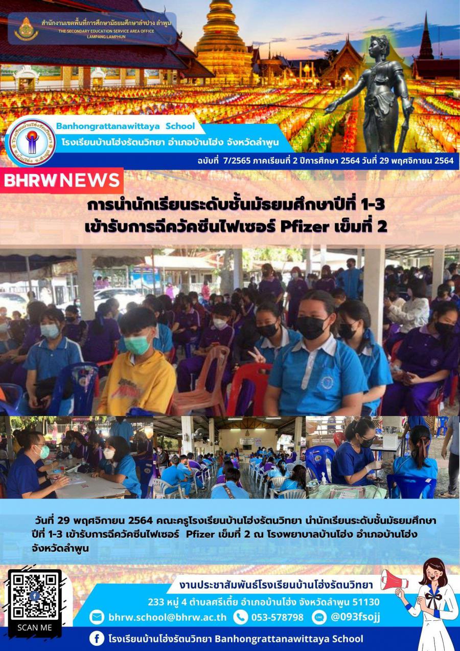 วันที่ 29 พฤศจิกายน 2564 คณะครูโรงเรียนบ้านโฮ่งรัตนวิทยา นำนักเรียนระดับชั้นมัธยมศึกษาปีที่ 1-3 เข้ารับการฉีควัคซีนไฟเซอร์ ????https://static.xx.fbcdn.net/images/emoji.php/v9/t26/1.5/16/1f489.png" style="border:0px; height:16px; width:16px" /> Pfizer เข็มที่ 2 ณ โรงพยาบาลบ้านโฮ่ง อำเภอบ้านโฮ่ง จังหวัดลำพูน