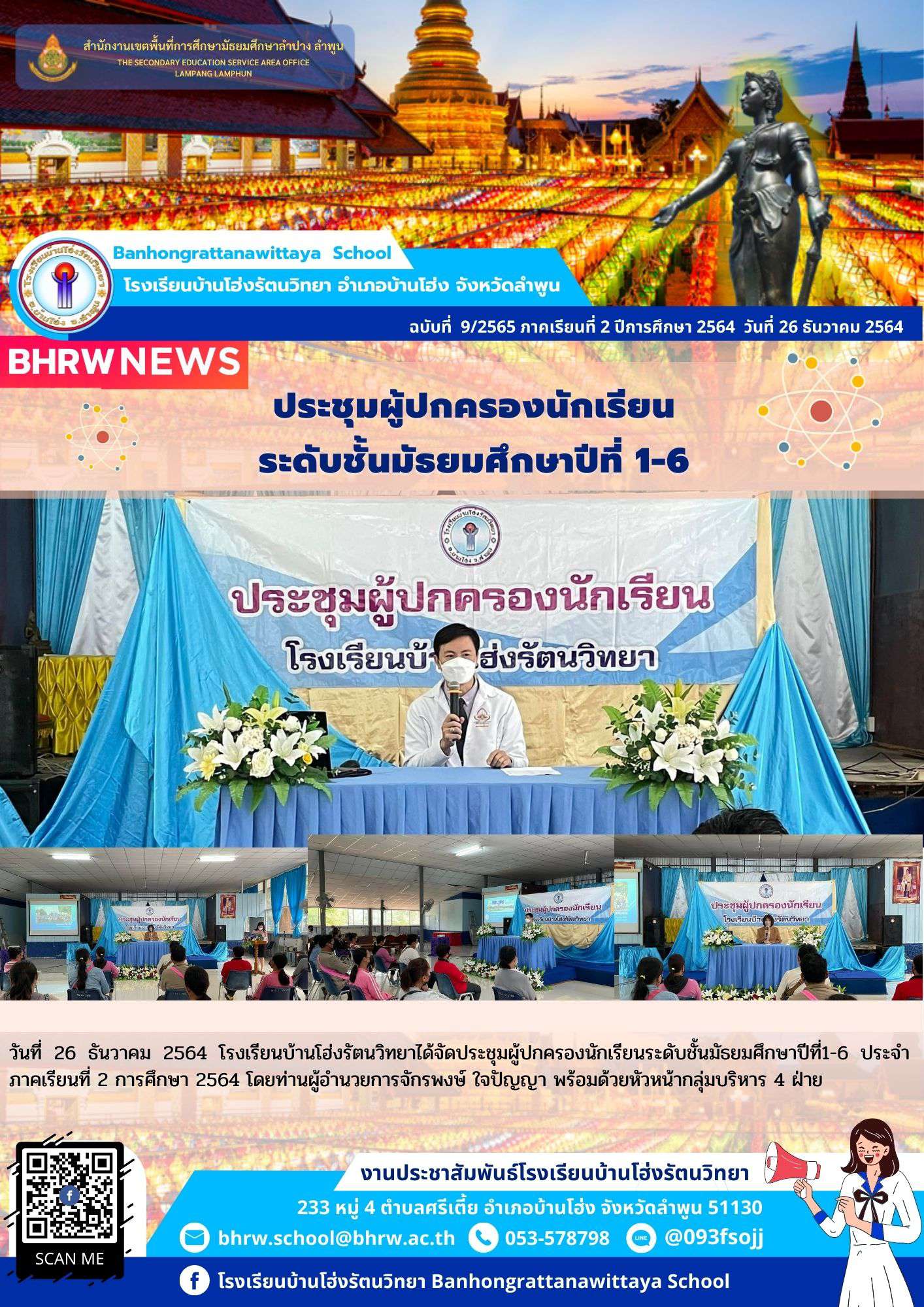 วันที่ 26 ธันวาคม 2564 โรงเรียนบ้านโฮ่งรัตนวิทยาได้จัดประชุมผู้ปกครองนักเรียนระดับชั้นมัธยมศึกษาปีที่1-6 ประจำภาคเรียนที่ 2 การศึกษา 2564 โดยท่านผู้อำนวยการจักรพงษ์ ใจปัญญา พร้อมด้วยหัวหน้ากลุ่มบริหาร 4 ฝ่าย ได้รายงานผลการดำเนินงานของโรงเรียนในภาคเรียนที่ผ่านมาและแจ้งนโยบายการจัดการศึกษาของโรงเรียน ในภาคเรียนที่ 2 ปีการศึกษา 2564 พร้อมทั้งมอบเกียรติบัตรให้แก่นักเรียนที่มีผลการเรียนเฉลี่ยสูงสุด 3 อันดับ ของทุกระดับชั้น และมอบทุนการศึกษาให้แก่นักเรียนที่มีความประพฤติดี จำนวน 12 ทุน ณ หอประชุมประภัสสร โรงเรียนบ้านโฮ่งรัตนวิทยา