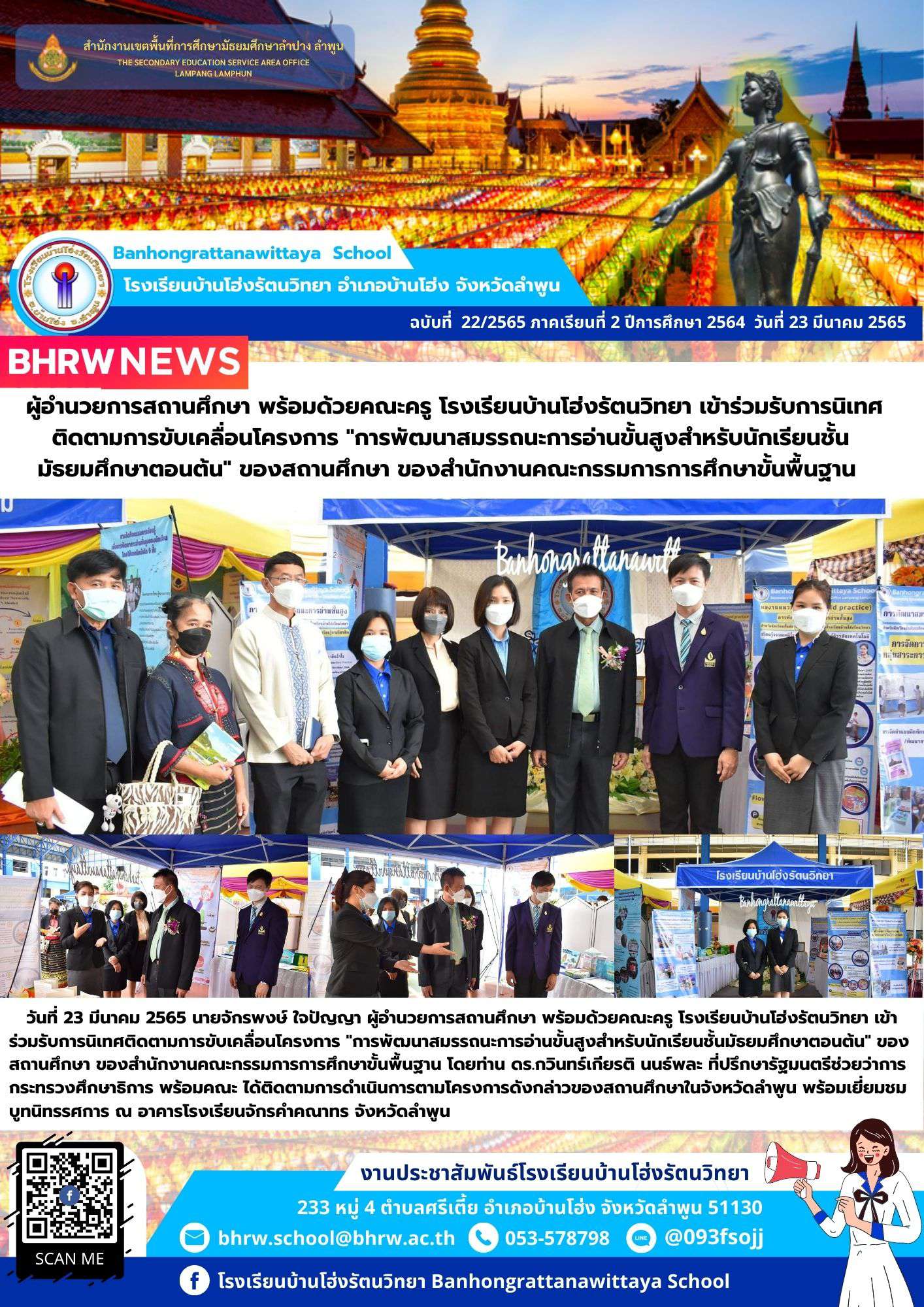วันที่ 23 มีนาคม 2565 นายจักรพงษ์ ใจปัญญา ผู้อำนวยการสถานศึกษา พร้อมด้วยคณะครู โรงเรียนบ้านโฮ่งรัตนวิทยา เข้าร่วมรับการนิเทศติดตามการขับเคลื่อนโครงการ "การพัฒนาสมรรถนะการอ่านขั้นสูงสำหรับนักเรียนชั้นมัธยมศึกษาตอนต้น" ของสถานศึกษา ของสำนักงานคณะกรรมการการศึกษาขั้นพื้นฐาน โดยท่าน ดร.กวินทร์เกียรติ นนธ์พละ ที่ปรึกษารัฐมนตรีช่วยว่าการกระทรวงศึกษาธิการ พร้อมคณะ ได้ติดตามการดำเนินการตามโครงการดังกล่าวของสถานศึกษาในจังหวัดลำพูน พร้อมเยี่ยมชมบูทนิทรรศการ ณ อาคารโรงเรียนจักรคำคณาทร จังหวัดลำพูน