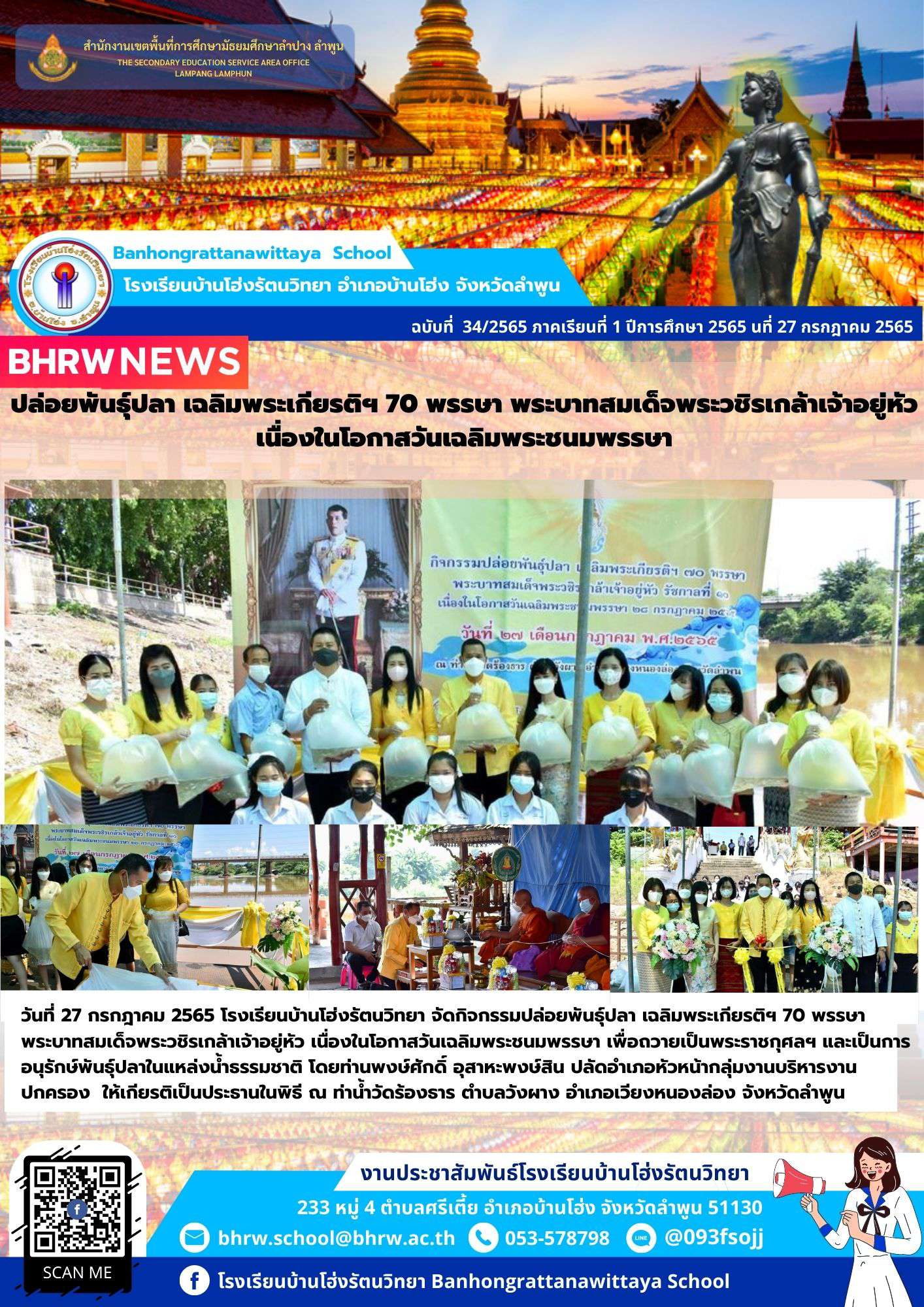 วันที่ 27 กรกฎาคม 2565 โรงเรียนบ้านโฮ่งรัตนวิทยา จัดกิจกรรมปล่อยพันธุ์ปลา เฉลิมพระเกียรติฯ 70 พรรษา พระบาทสมเด็จพระวชิรเกล้าเจ้าอยู่หัว เนื่องในโอกาสวันเฉลิมพระชนมพรรษา เพื่อถวายเป็นพระราชกุศลฯ และเป็นการอนุรักษ์พันธุ์ปลาในแหล่งน้ำธรรมชาติ โดยท่านพงษ์ศักดิ์ อุสาหะพงษ์สิน ปลัดอำเภอหัวหน้ากลุ่มงานบริหารงานปกครอง (ปลัดอาวุโสอำเภอบ้านโฮ่ง) ให้เกียรติเป็นประธานในพิธี ณ ท่าน้ำวัดร้องธาร ตำบลวังผาง อำเภอเวียงหนองล่อง จังหวัดลำพูน