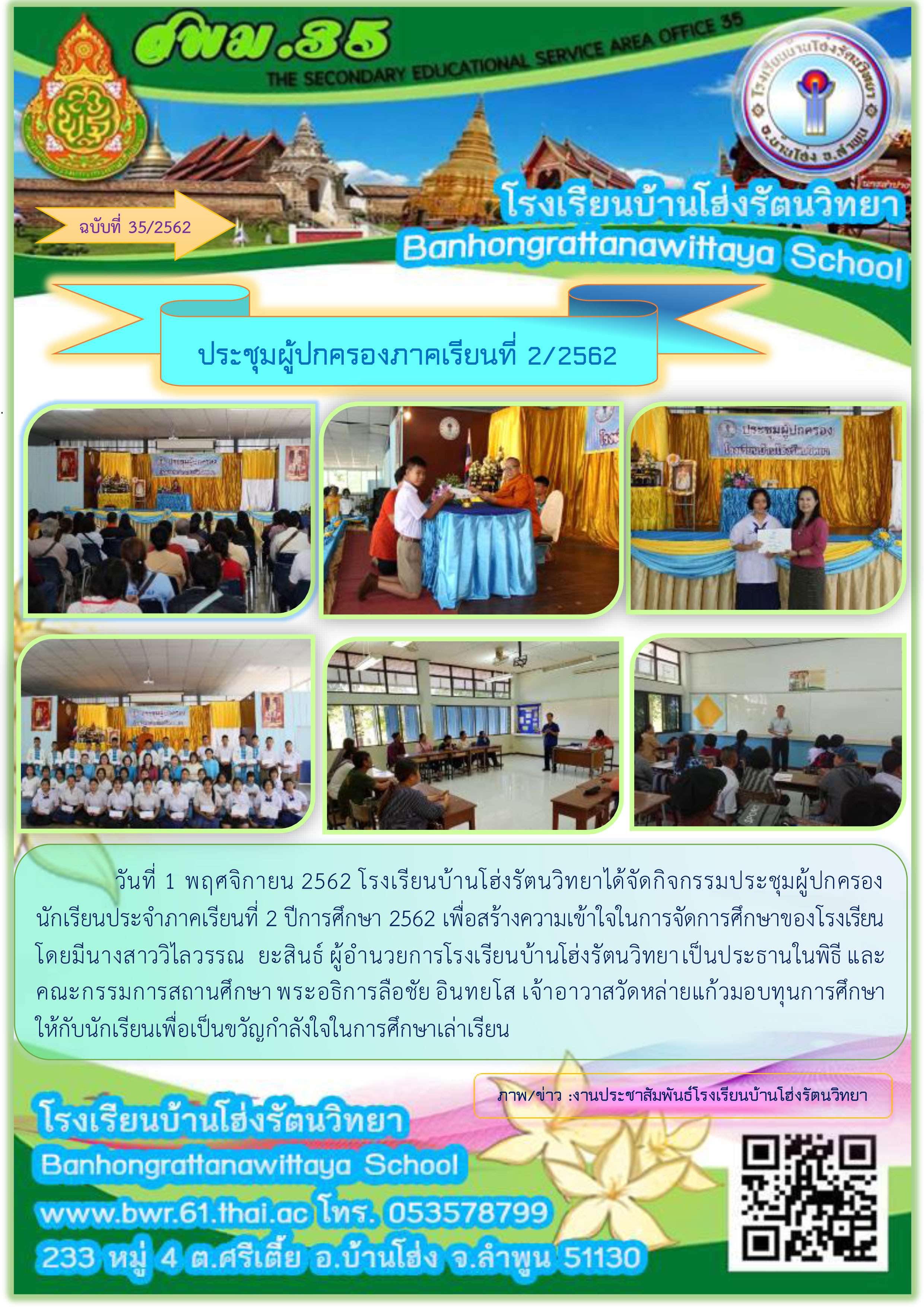 วันที่ 1 พฤศจิกายน 2562 โรงเรียนบ้านโฮ่งรัตนวิทยาได้จัดกิจกรรมประชุมผู้ปกครองนักเรียนประจำภาคเรียนที่ 2 ปีการศึกษา 2562 เพื่อสร้างความเข้าใจในการจัดการศึกษาของโรงเรียน โดยมีนางสาววิไลวรรณ ยะสินธ์ ผู้อำนวยการโรงเรียนบ้านโฮ่งรัตนวิทยาเป็นประธานในพิธี และคณะกรรมการสถานศึกษา พระอธิการลือชัย อินทยโส เจ้าอาวาสวัดหล่ายแก้วมอบทุนการศึกษาให้กับนักเรียนเพื่อเป็นขวัญกำลังใจในการศึกษาเล่าเรียน