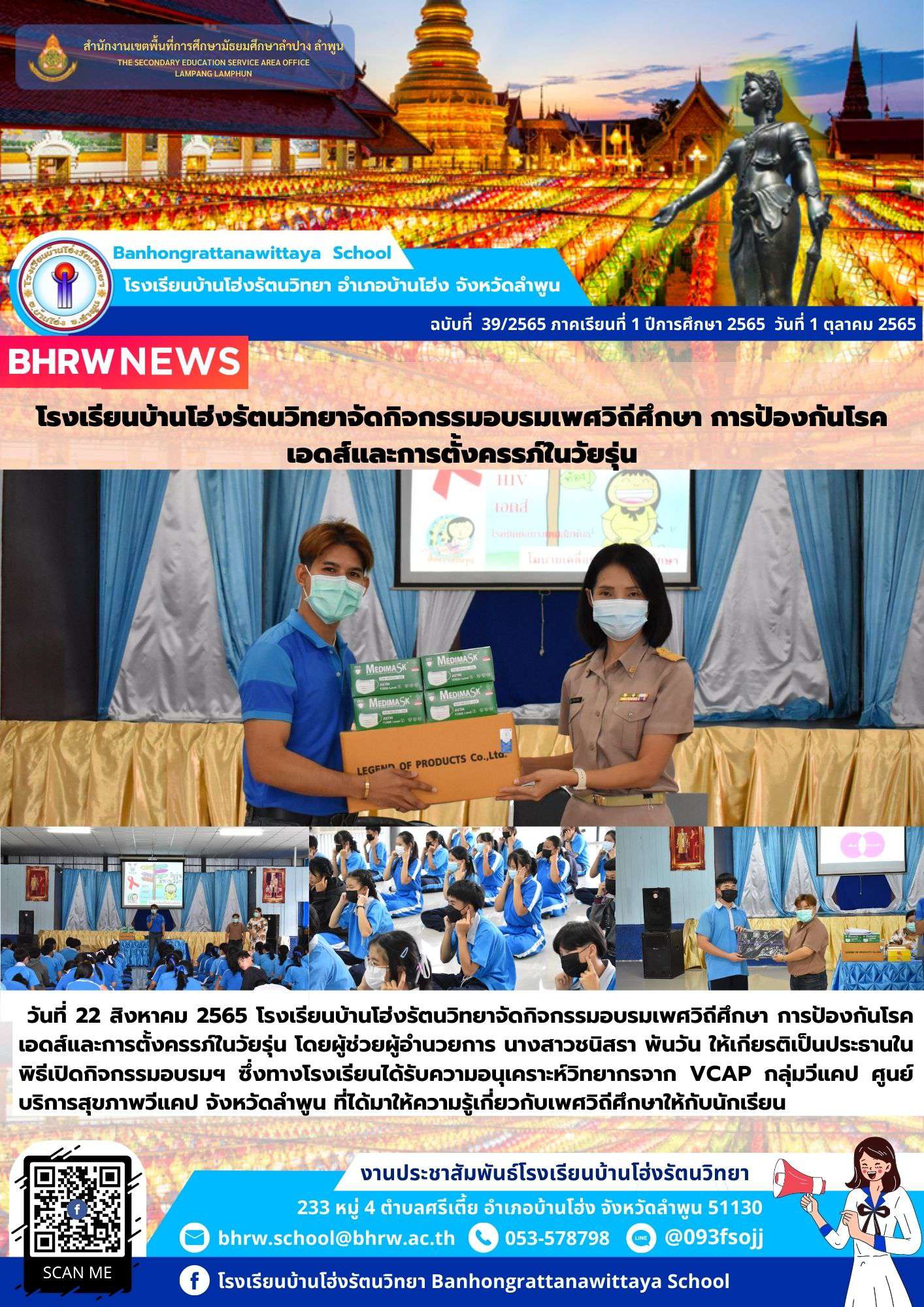วันที่ 22 สิงหาคม 2565 โรงเรียนบ้านโฮ่งรัตนวิทยาจัดกิจกรรมอบรมเพศวิถีศึกษา การป้องกันโรคเอดส์และการตั้งครรภ์ในวัยรุ่น โดยผู้ช่วยผู้อำนวยการ นางสาวชนิสรา พันวัน ให้เกียรติเป็นประธานในพิธีเปิดกิจกรรมอบรมฯ ซึ่งทางโรงเรียนได้รับความอนุเคราะห์วิทยากรจาก VCAP กลุ่มวีแคป ศูนย์บริการสุขภาพวีแคป จังหวัดลำพูน ที่ได้มาให้ความรู้เกี่ยวกับเพศวิถีศึกษาให้กับนักเรียน ทางโรงเรียนขอขอบพระคุณมา ณ ที่นี้ กิจกรรมจัดขึ้น ณ หอประชุมประภัสสร โรงเรียนบ้านโฮ่งรัตนวิทยา