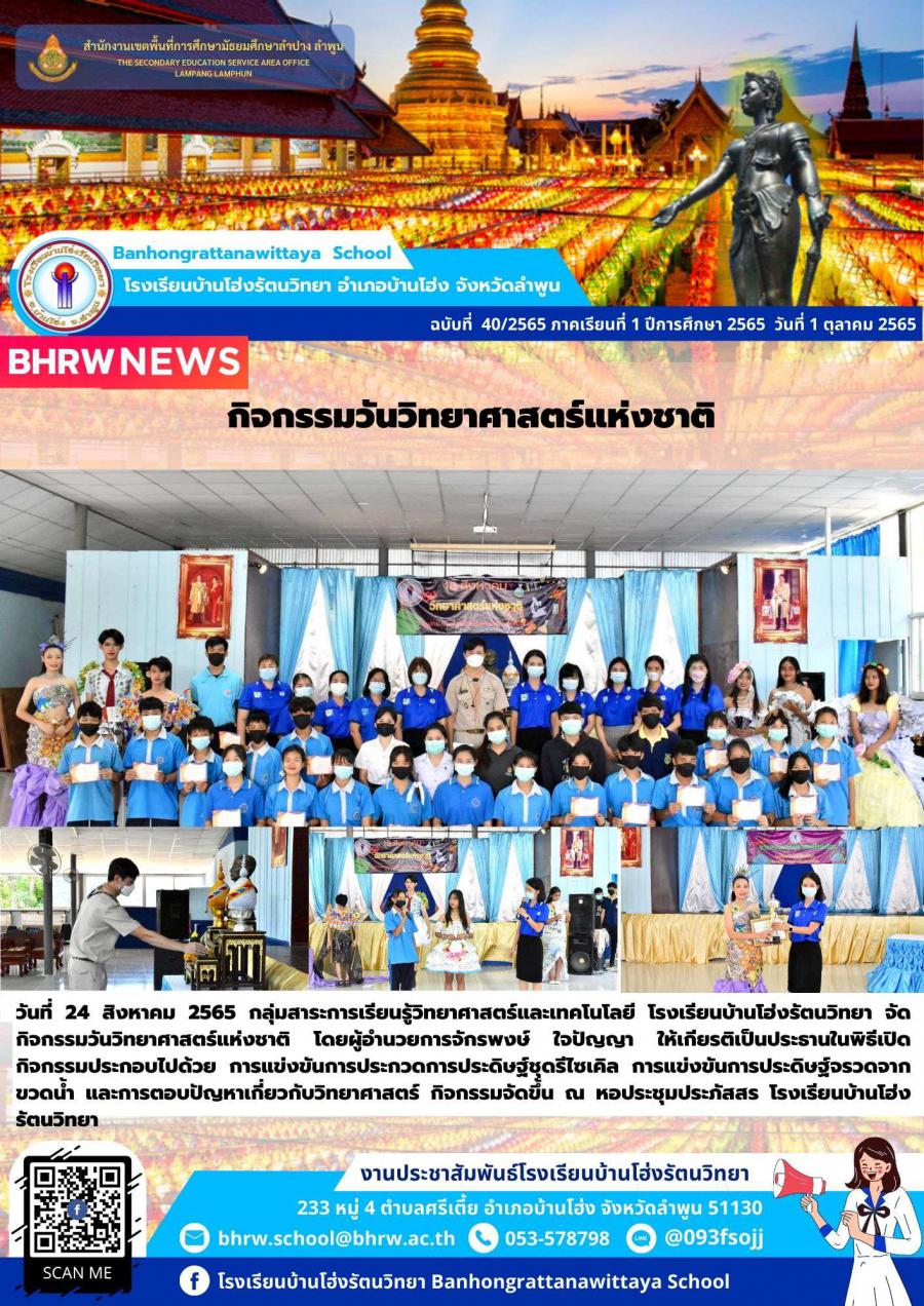 วันที่ 24 สิงหาคม 2565 กลุ่มสาระการเรียนรู้วิทยาศาสตร์และเทคโนโลยี โรงเรียนบ้านโฮ่งรัตนวิทยา จัดกิจกรรมวันวิทยาศาสตร์แห่งชาติ โดยผู้อำนวยการจักรพงษ์ ใจปัญญา ให้เกียรติเป็นประธานในพิธีเปิด กิจกรรมประกอบไปด้วย การแข่งขันการประกวดการประดิษฐ์ชุดรีไซเคิล การแข่งขันการประดิษฐ์จรวดจากขวดน้ำ และการตอบปัญหาเกี่ยวกับวิทยาศาสตร์ กิจกรรมจัดขึ้น ณ หอประชุมประภัสสร โรงเรียนบ้านโฮ่งรัตนวิทยา