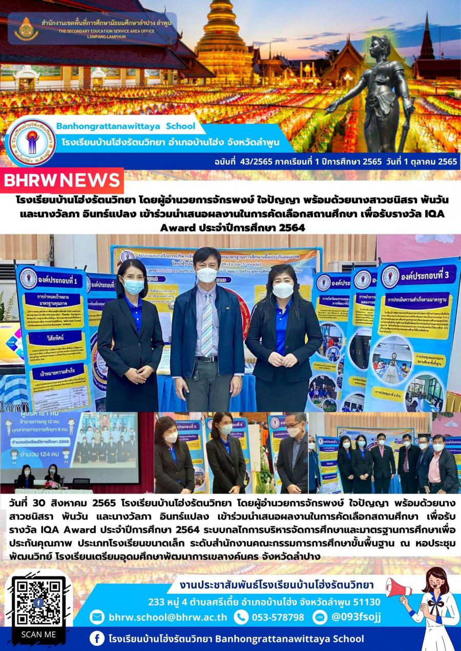 วันที่ 30 สิงหาคม 2565 โรงเรียนบ้านโฮ่งรัตนวิทยา โดยผู้อำนวยการจักรพงษ์ ใจปัญญา พร้อมด้วยนางสาวชนิสรา พันวัน และนางวัลภา อินทร์แปลง เข้าร่วมนำเสนอผลงานในการคัดเลือกสถานศึกษา เพื่อรับรางวัล IQA Award ประจำปีการศึกษา 2564 ระบบกลไกการบริหารจัดการศึกษาและมาตรฐานการศึกษาเพื่อประกันคุณภาพ ประเภทโรงเรียนขนาดเล็ก ระดับสำนักงานคณะกรรมการการศึกษาขั้นพื้นฐาน ณ หอประชุมพัฒนวิทย์ โรงเรียนเตรียมอุดมศึกษาพัฒนาการเขลางค์นคร จังหวัดลำปาง